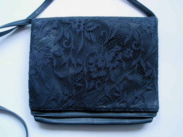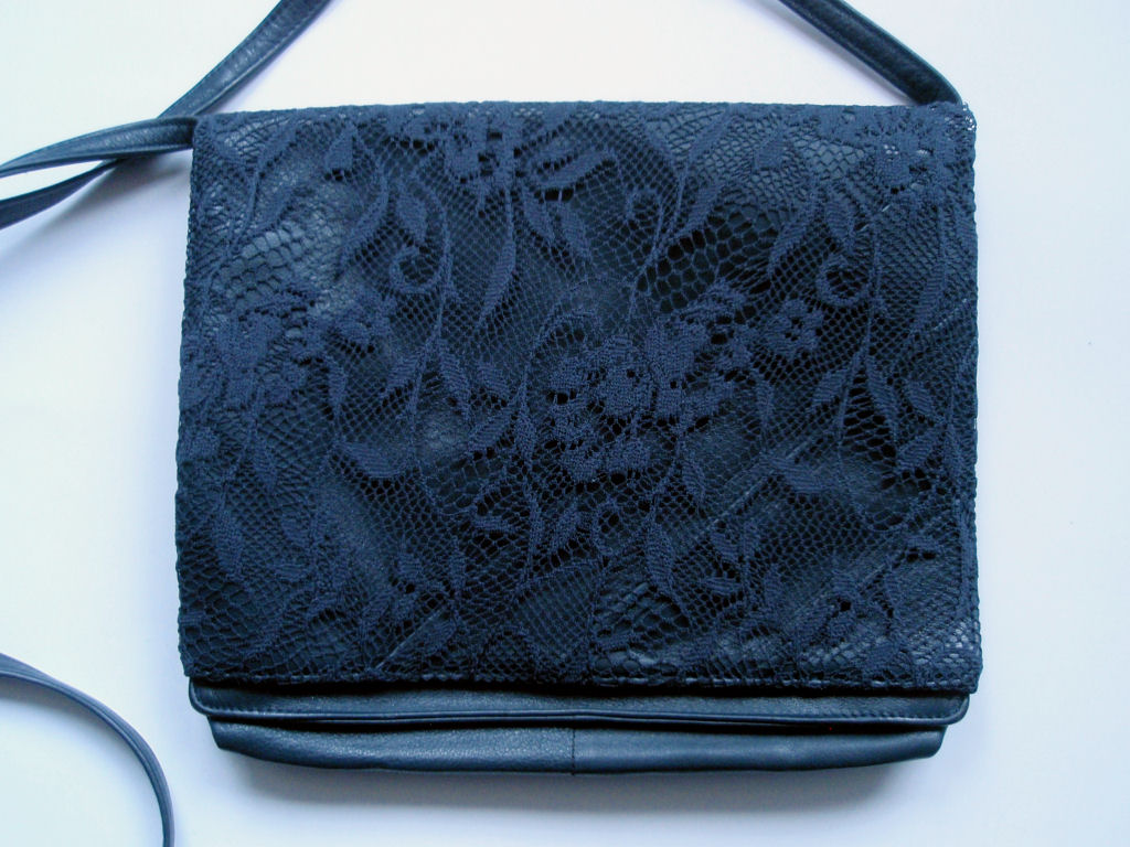 Spitze. Haaach. Gerne. Beim Aufräumen des Dachbodens hat mein ehrenwerter Papa die ein oder anderen interessanten Sachen gefunden, die ich vor dem großen grünen Sack retten konnte. Unter anderem ein Täschchen aus graublauschwarzem Leder. An sich sehr hübsch, aber irgendwie nicht so ganz mein Stil. Falls ich einen definierbaren Stil habe... Von kürzlichen Einkäufen habe ich noch einen halben Meter Spitze...in einer passenden Farbe!